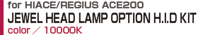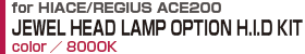 3型ハイエース前期/後期の全グレードに対応、純正HID装着車は純正バラスト、バーナー、など純正ヘッドランプから部品を移植し取り付け、オートレベライザーの移植も可能となり機能を損なわない純正同等、違和感の無い取り付けが可能。